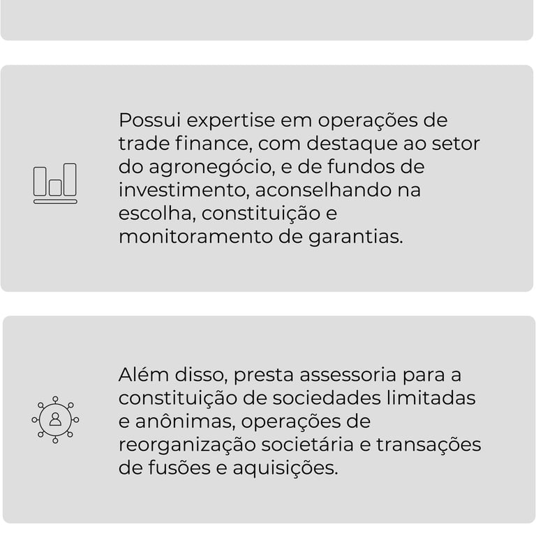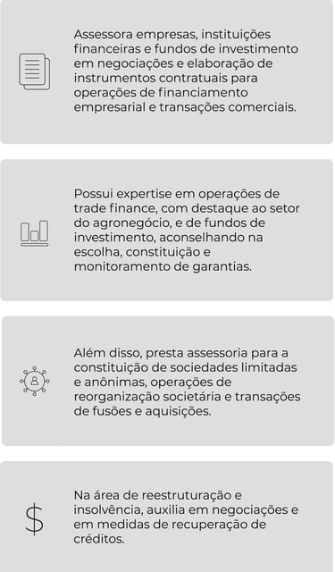 Assessora empresas, instituições financeiras e fundos de investimento em negociações e elaboração de instrumentos contratuais para operações de financiamento empresarial e transações comerciais.